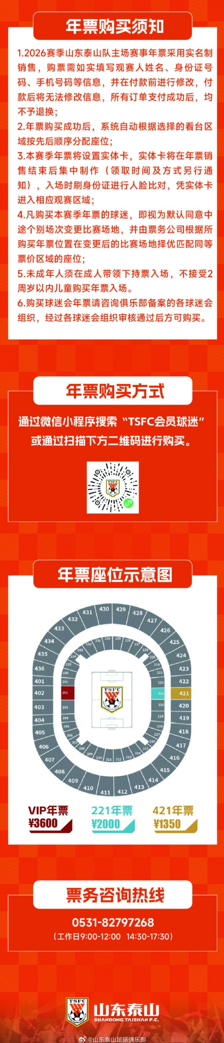2月6日讯 泰山官方发布2026赛季主场赛事年票销售公告,价格1350元-3600元。